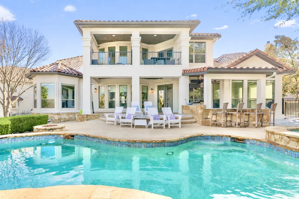 Located behind the gates of the prestigious University of Texas Golf Club, this exceptional luxury home backs to Hole 18 and offers breathtaking golf course views with true resort-style living. Featuring 4 spacious bedrooms, 3.5 baths, a private study, and multiple living and entertaining areas, the home blends elegance with everyday comfort. A grand curved staircase welcomes you into the light-filled interior, where the chef’s kitchen flows seamlessly into the main living space with soaring double-height ceilings, custom built-ins, fireplace, and expansive windows. Recent updates include fresh paint, refinished cabinetry, upgraded lighting, and beautiful quartzite countertops. The main-level primary suite offers a spa-like retreat with dual vanities, soaking tub, glass shower, and oversized walk-in closet. Upstairs features a game room, media room, and three generous secondary bedrooms. Step outside to a private backyard oasis complete with pool, spa, fire pit, cabana, and outdoor kitchen—perfect for relaxing or entertaining. Located in Steiner Ranch with access to top-rated Leander ISD schools, trails, parks, pools, and the Lake Austin waterfront Lake Club, this meticulously maintained home offers luxury, lifestyle, and an unbeatable location.